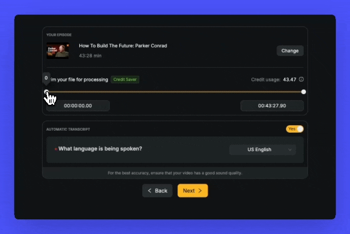 Now, when you upload a video or audio file, you can select only the portion you want to process instead of using credits for the entire file.